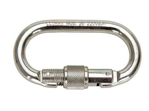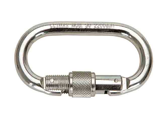 Descripción: Mosquetón de acero. Cierre automático mediante acción del muelle resorte interior. Bloqueo manual mediante tuerca cilíndrica.