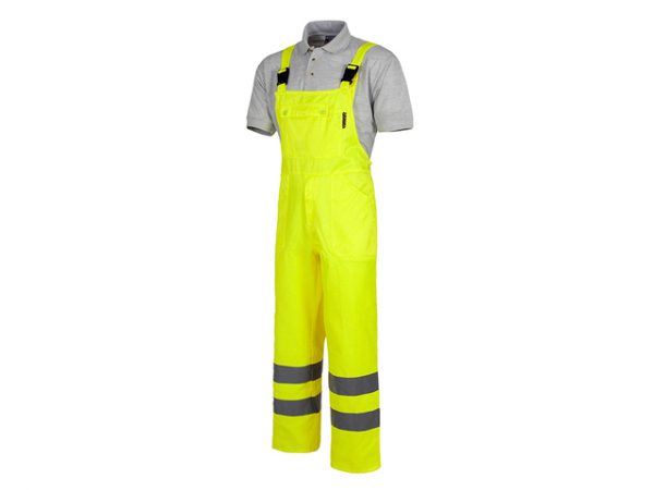 Descripción: Peto de alta visibilidad 60% algodón y 40% poliéster. Costuras dobles. Lavable. Tres bolsillos estándar, uno en el pecho y un portaherramientas. Abertura lateral. Tirantes y cintura elástica.